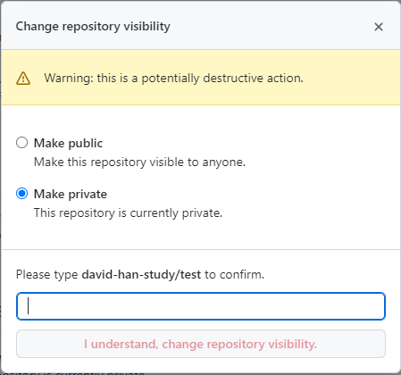 2. 맨 아래 Danger Zone 에서 'Change visibility' 클릭